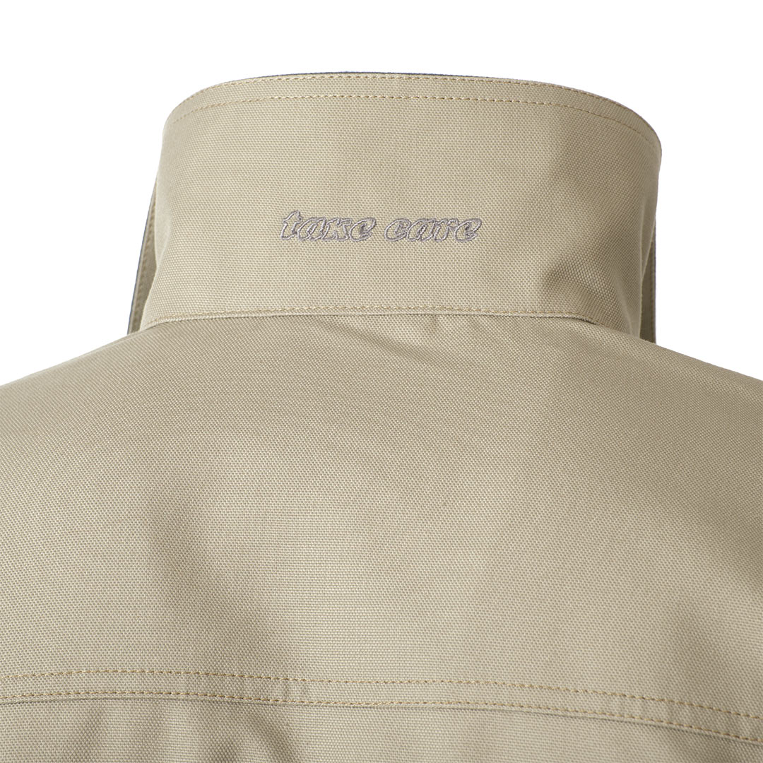 Летняя рабочая бежевая мужская куртка 374M-CY-05/55 из плотной износостойкой смесовой ткани (345 граммов на квадратный метр) с отделкой серого цвета. Комплектуйте с подходящим полукомбинезоном 55M-CY-05/55 или брюками 255M-CY-05/55, чтоб подобрать костюм для маляров, штукатуров и отделочников помещений.