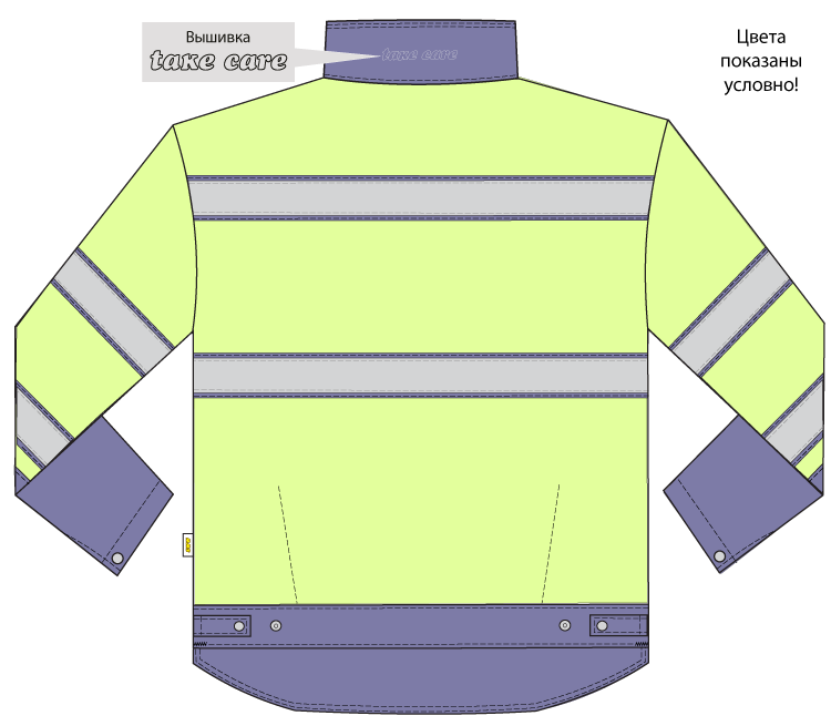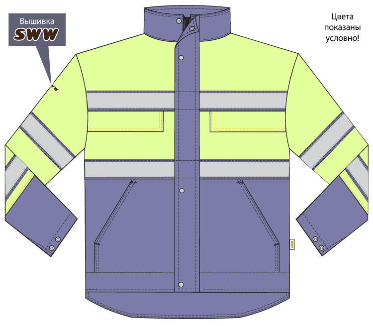 - Два ряда световозвращающей ленты (50 мм) спереди, сзади и на рукавах.