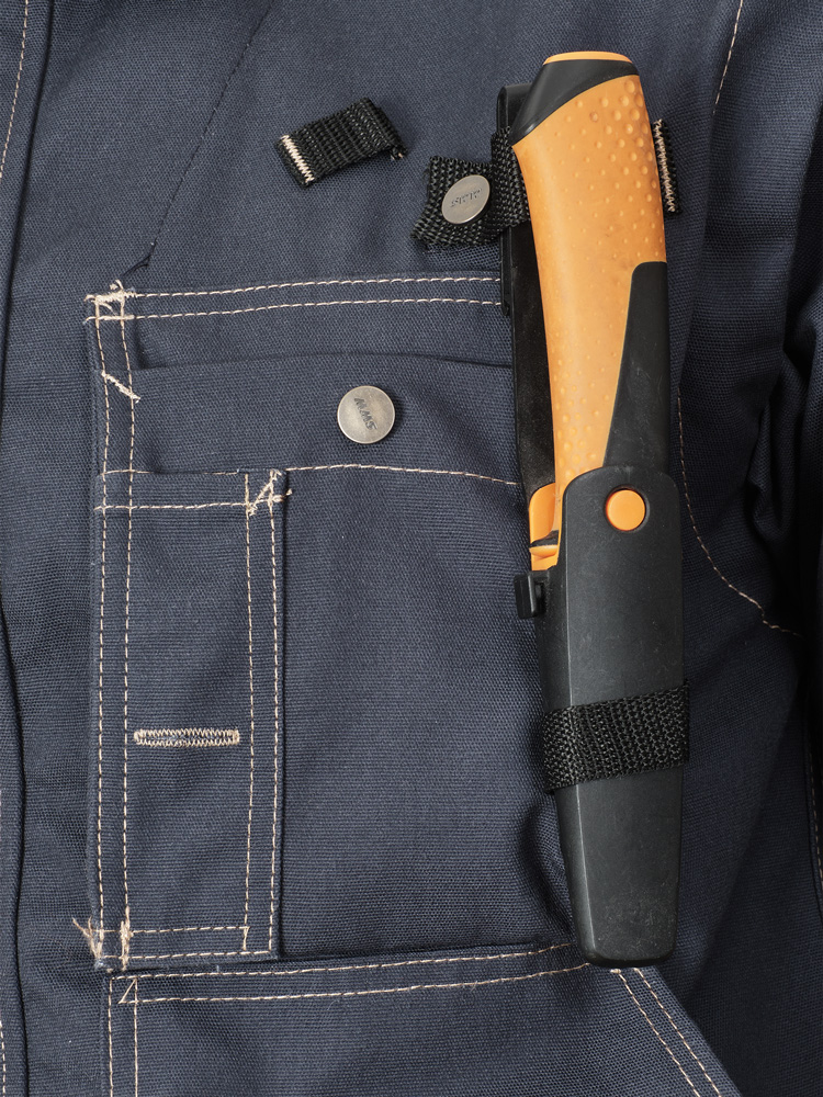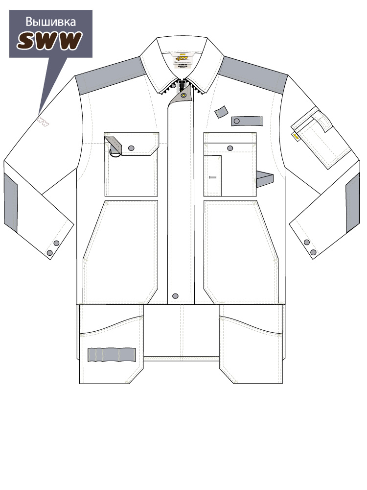 - Два нагрудных отлетных кармана с клапанами на кнопках фиксируются кнопками-колючками (правый нагрудный карман с петлей с полукольцом, левый нагрудный карман с отделением для карандаша и петлей для инструментов).