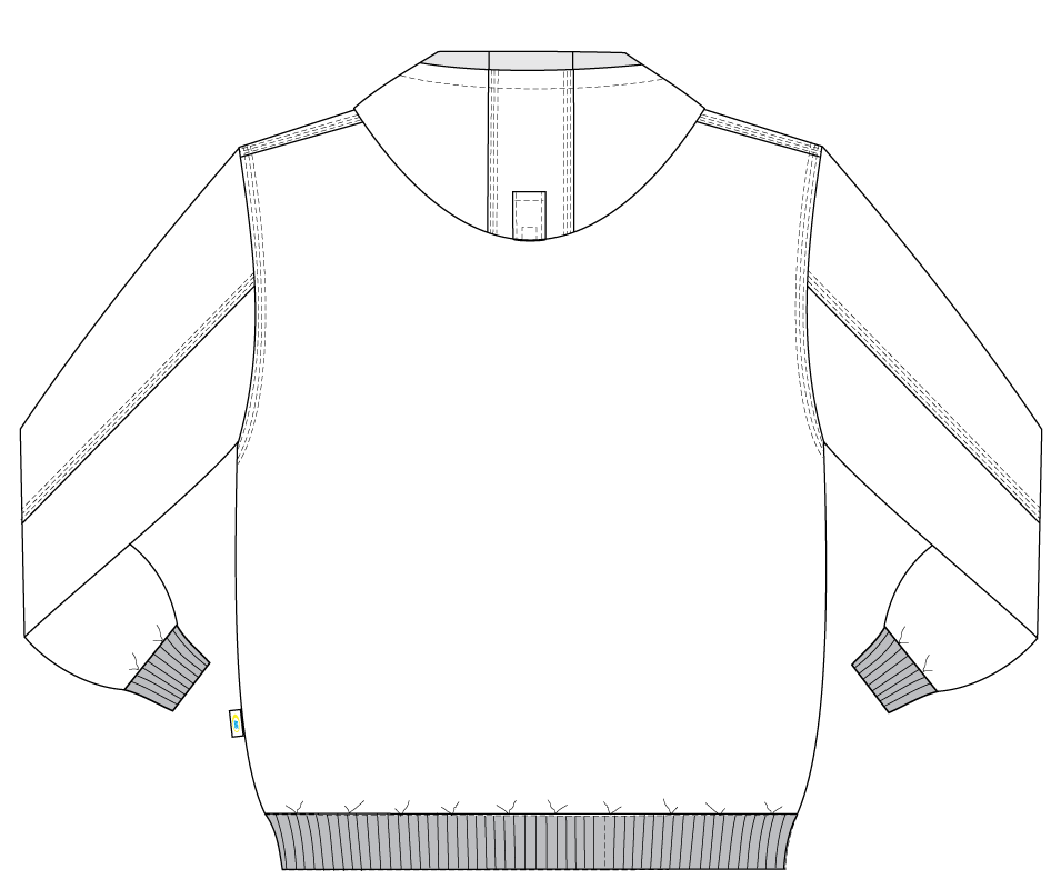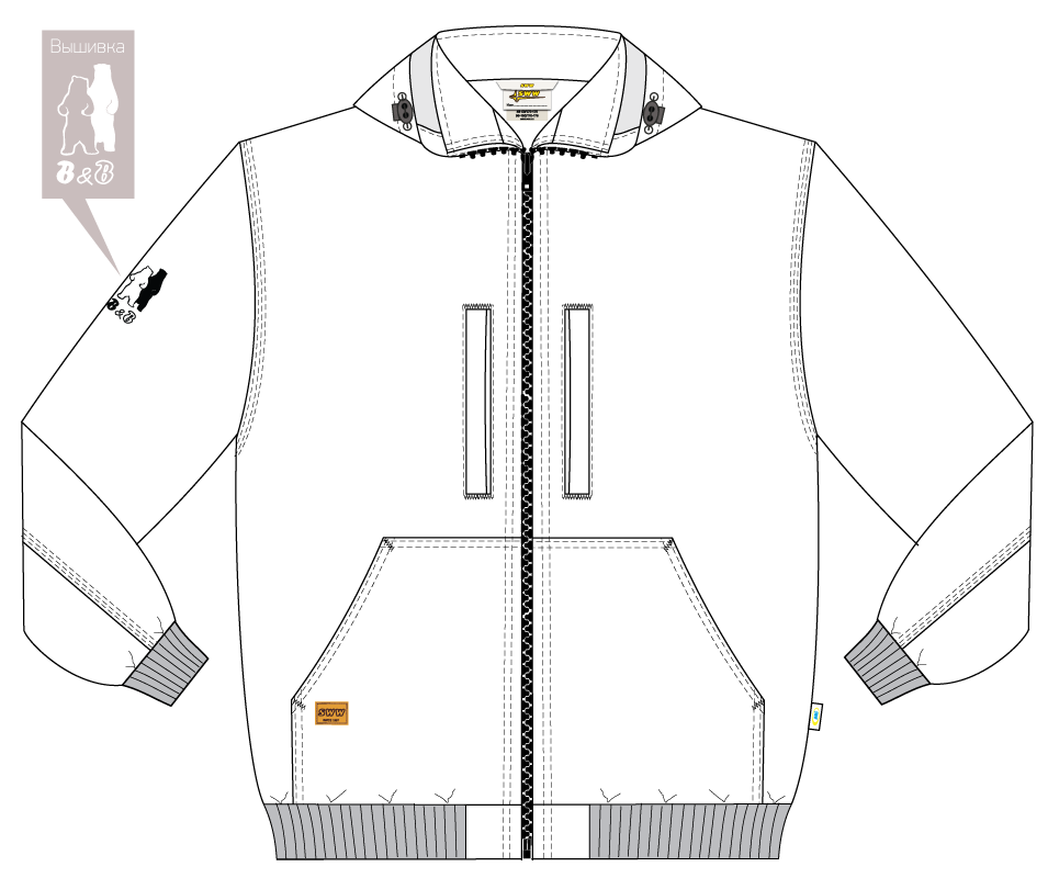 - Плечевые швы, швы соединения локтевых срезов на рукавах, центральной части капюшона, проймы выполнены в замок.