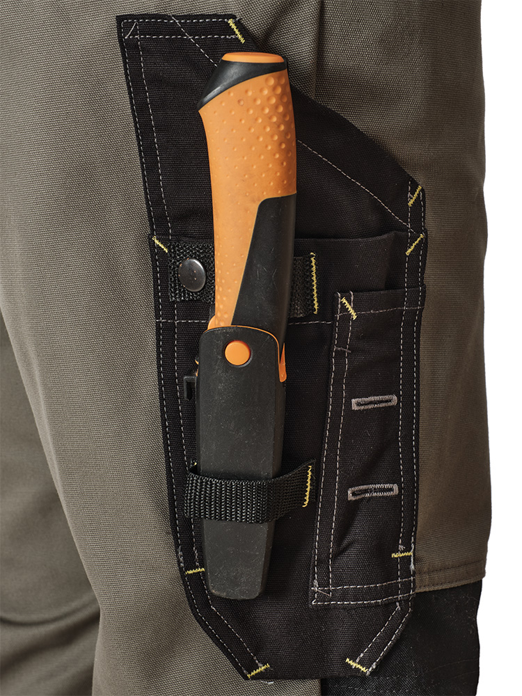 - На правой брючине высокий карман для инструмента с дополнительным карманом для карандаша и креплением для ножа.