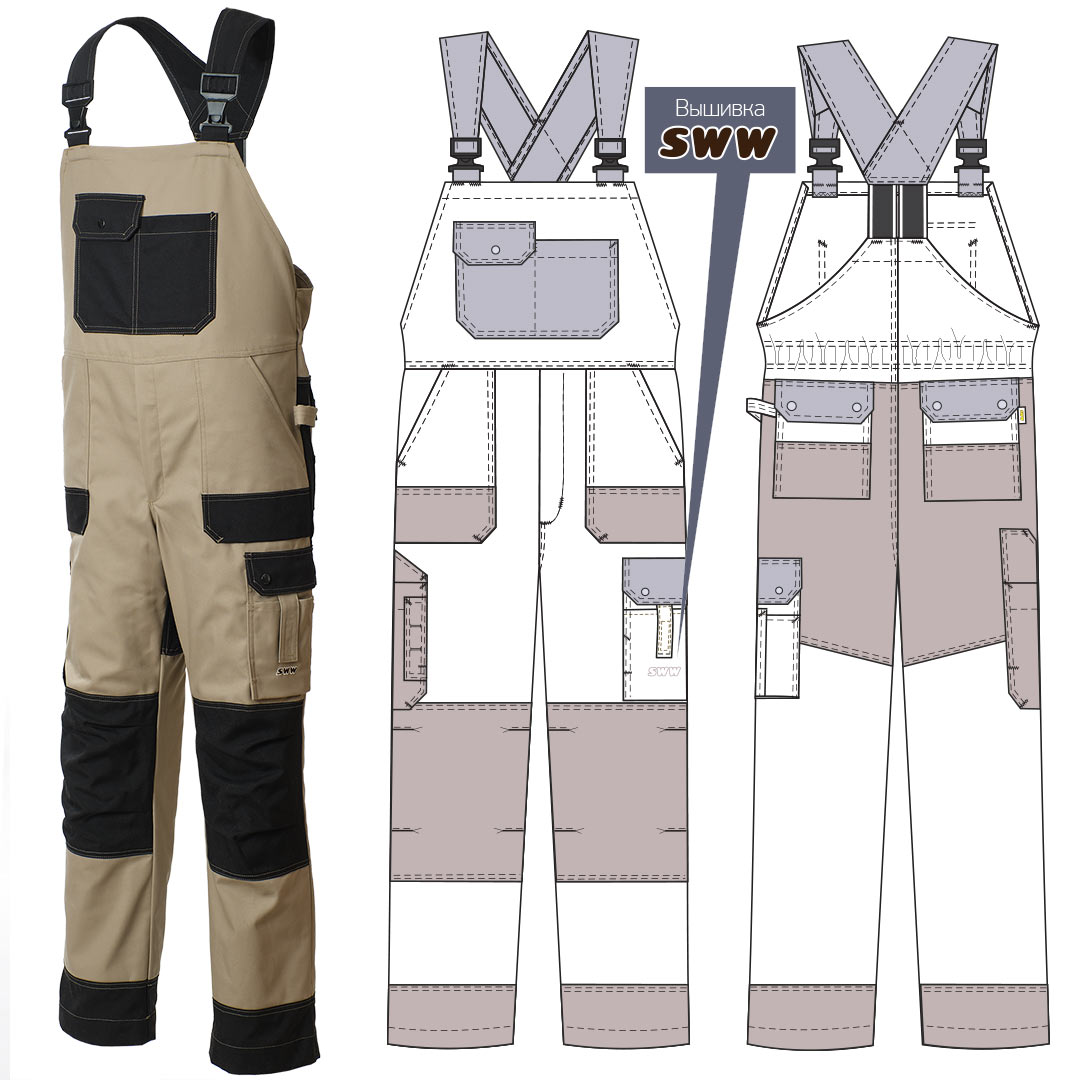 - Бретели, нагрудный карман, клапаны карманов из отделочной ткани.