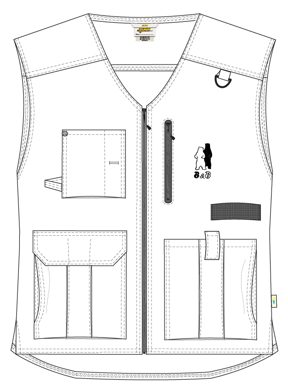 - Два нагрудных кармана: левый — внутренний, на молнии, правый — накладной, с кармашком для карандаша, петлей и кнопкой-пуговицей для крепления ножа в ножнах.