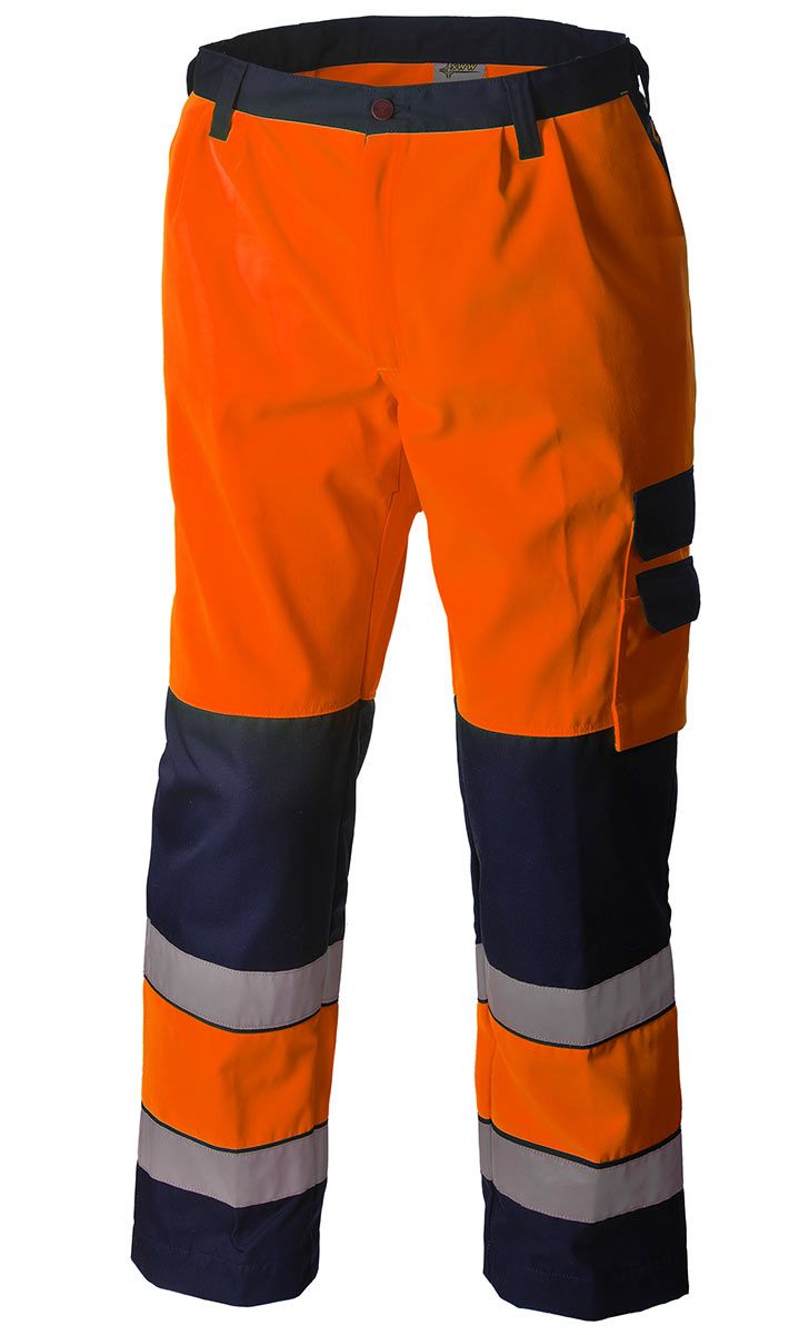 Летние сигнальные оранжево-синие брюки 2131N-P154-77/15. Использование полотна повышенной видимости и широкие (5 см) световозвращающие ленты обеспечат заметность при работе на дороге и в помещении в условиях пониженной видимости или в темное время суток.