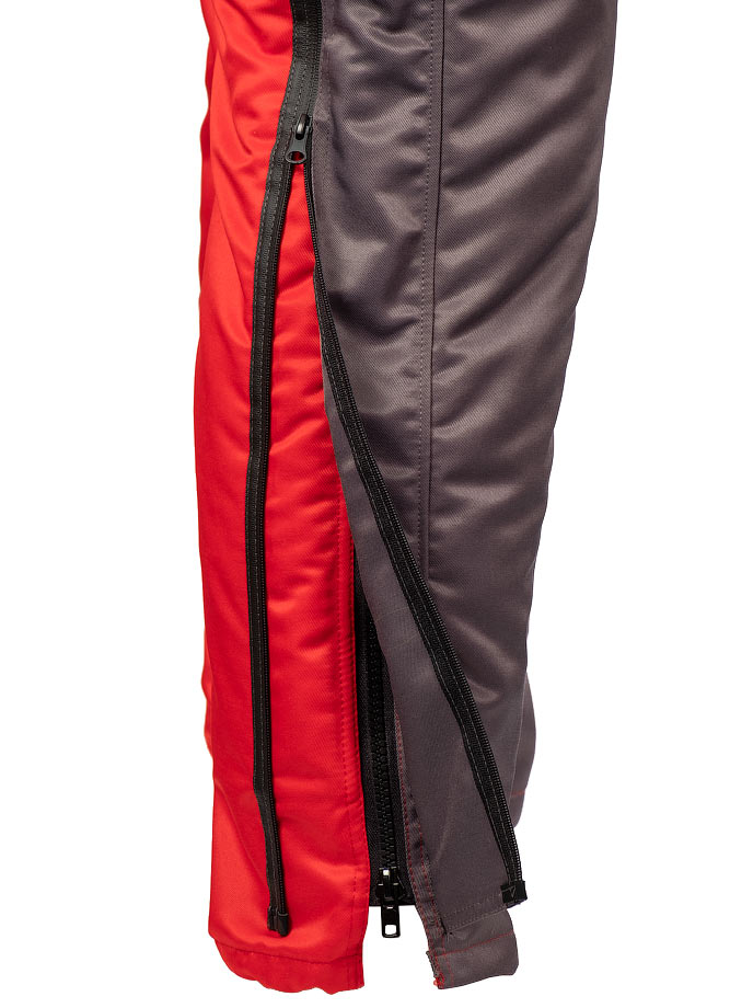 - По боковым швам штанин от линии талии до низа застежки-молнии с внутренней ветрозащитной планкой. С внешней стороны молния закрыта широкой планкой, которая застёгивается на специальную молнию на прорезиненной основе для предотвращения попадания снега под планку при сильном снеге и пурге.