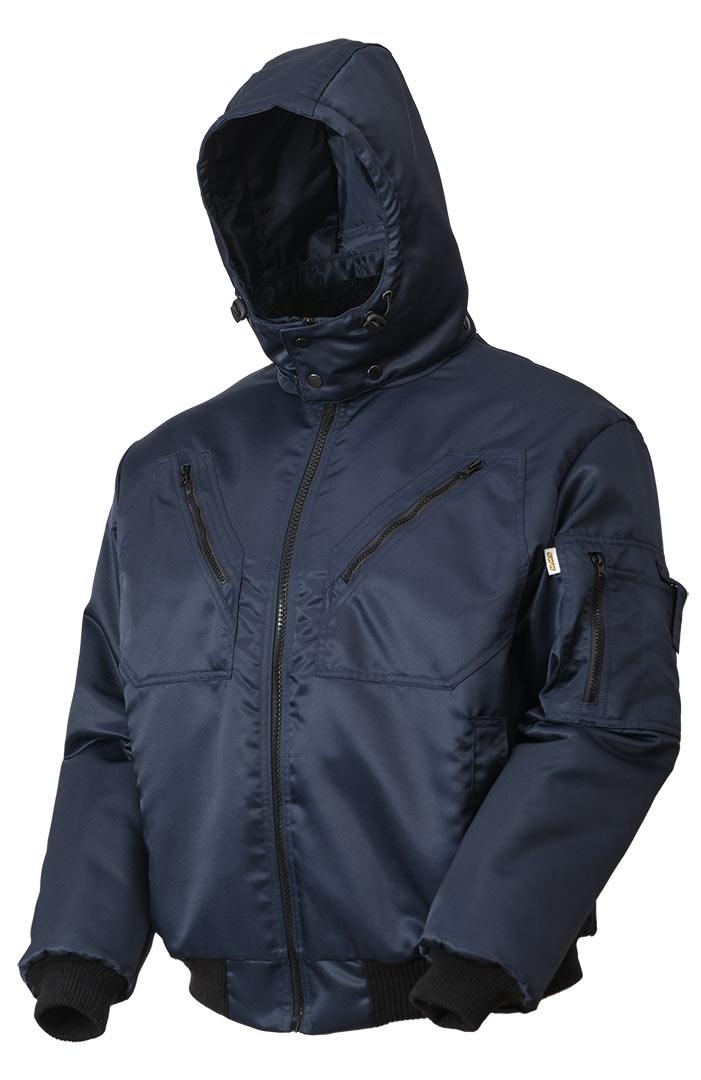 Зимняя укороченная куртка пилот (бомбер) 442KC-TWILL-15 на стеганой подкладке с утепленным отстегивающимся капюшоном. Десять карманов и кармашков, включая специальный карман на рукаве для телефона. Воротник с искусственным мехом, трикотажная резинка на поясе и манжетах. Эту модель можно использовать на работе и для повседневной носки.