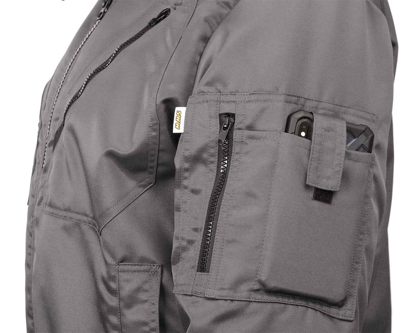 - Карман на молнии на левом рукаве с дополнительным карманом для телефона на застёжке-липучке и кармашком для ручек/карандашей.