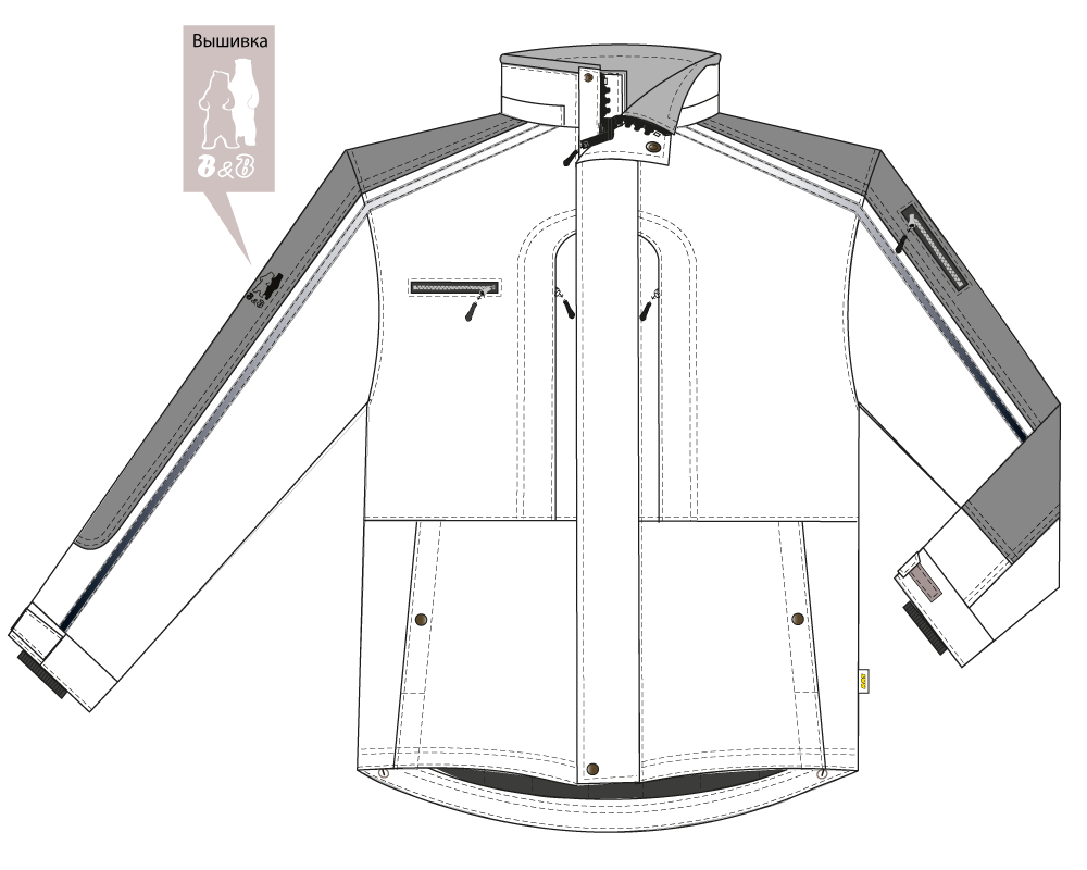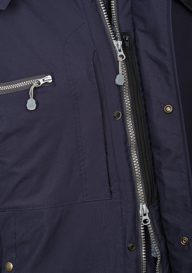 - Застёжка на молнию до верха воротника, закрытая ветрозащитной планкой на кнопках и с внутренней ветрозащитной планкой.