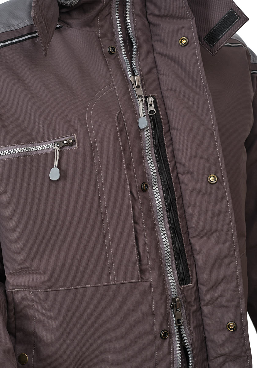 Зимняя укороченная куртка 622S-TWILL-55 на комбинированной подкладке с утепленным искусственным мехом отстегивающимся капюшоном. Девять карманов, включая специальный карман на рукаве для телефона, воротник с искусственным мехом, манжеты из трикотажной резинки. Эту модель можно использовать на работе и для повседневной носки.