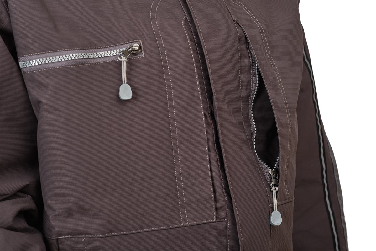 - Два внутренних кармана — слева нагрудный карман на молнии, справа накладной карман на пуговице.