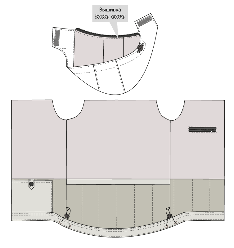 - По передним половинкам рукавов и полочкам, вдоль декоративных вставок,настрочена тесьма со световозвращающим эффектом.