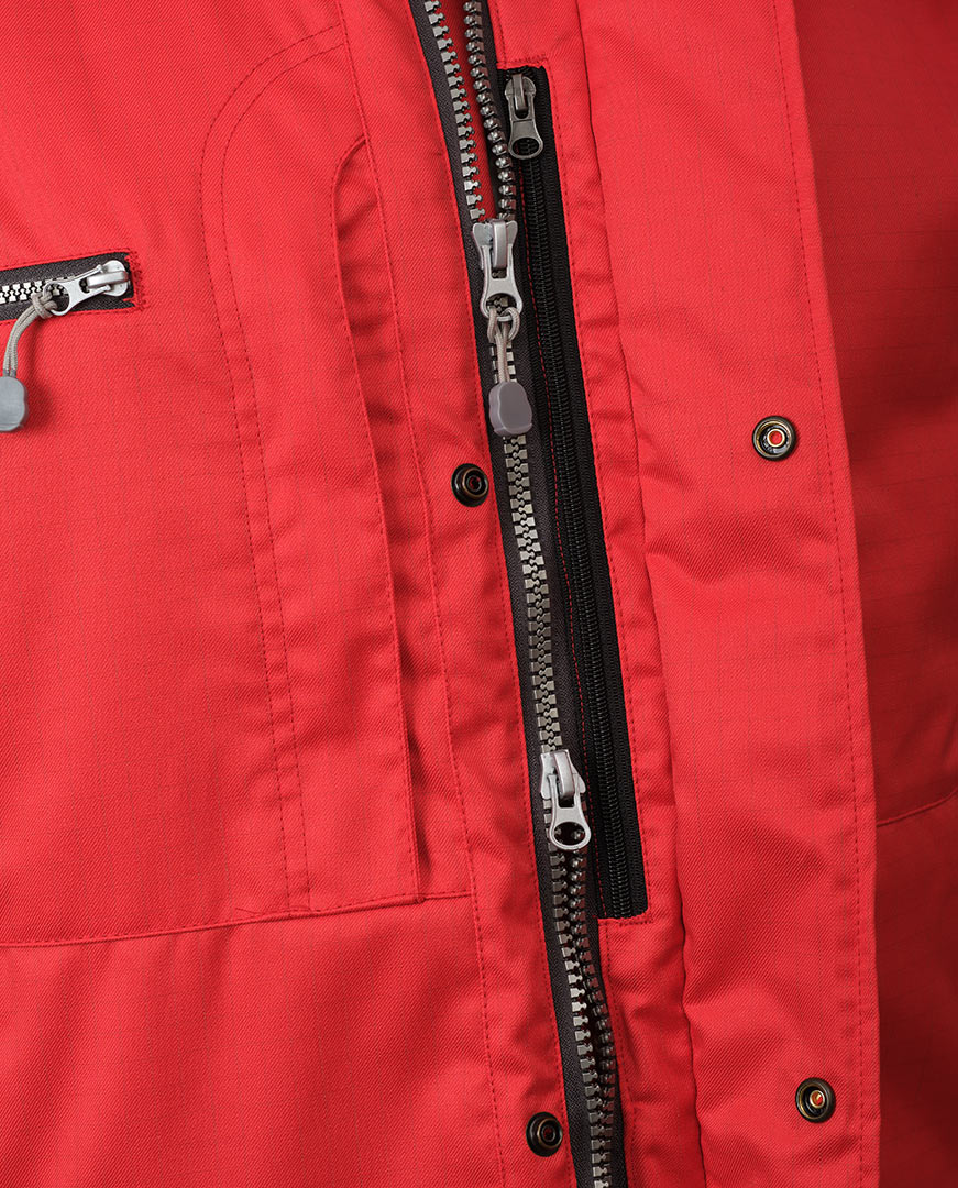 - Застёжка на молнию до верха воротника, закрытая ветрозащитной планкой на кнопках и с внутренней ветрозащитной планкой.
