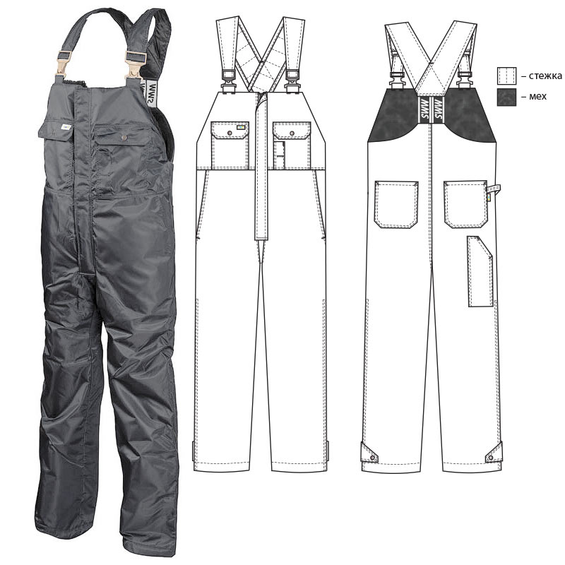Рабочий зимний мужской полукомбинезон 42A-TWILL-55 на подкладке из искусственного меха. Низ у штанин с молниями, чтобы можно было регулировать их ширину в зависимости от надетой обуви. Восемь карманов. регулируемые бретели, надёжное скандинавское качество. Полукомбинезон можно носить с одной изукороченных зимних курток модели 442, или судлиненной зимней курткой модели 428.