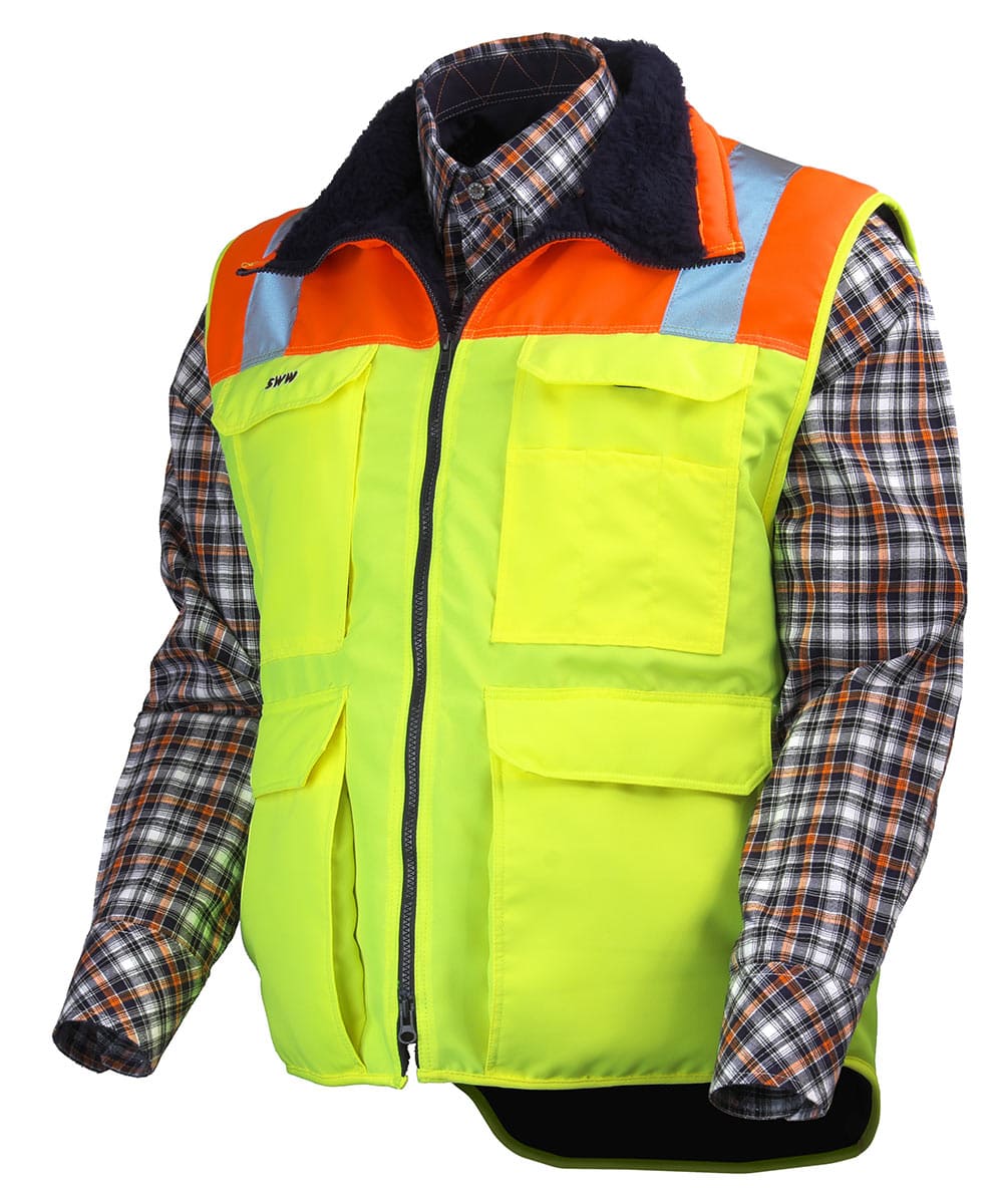 Жилет утеплённый сигнальный 515H-BT/NEG-71/77 на подкладке из искусственного меха сохранит тепло вашего тела в прохладном помещении и на улице, и сделает вас очень заметным, благодаря яркой ткани флоуресцентных расцветок и световозвращающим лентам на плечах. Наш жилет подойдет работникам складов, центров логистики, водителям, экспедиторам и курьерам. У жилета тринадцать карманов и кармашков, где найдется место для карандаша, ручки, фломастера, телефона, документов, а пара карманов утепленных искусственным мехом подойдут для того, чтоб согреть замерзшие руки.